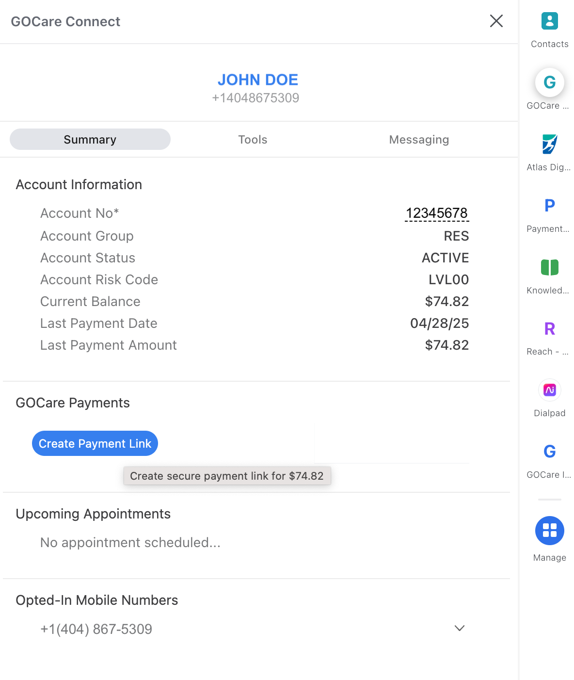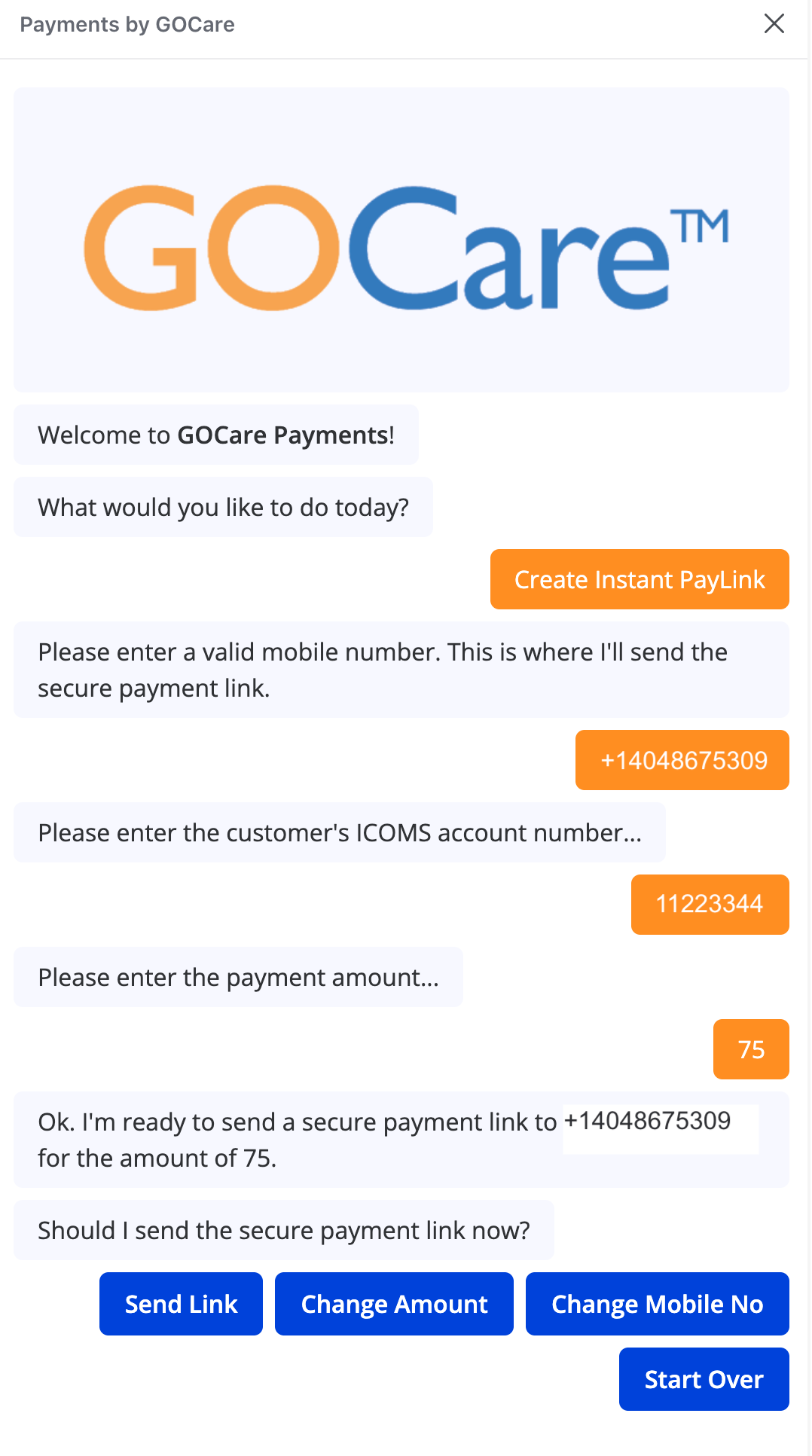 Agents in GOCare Connect can send a secure payment link during a live SMS or webchat conversation.