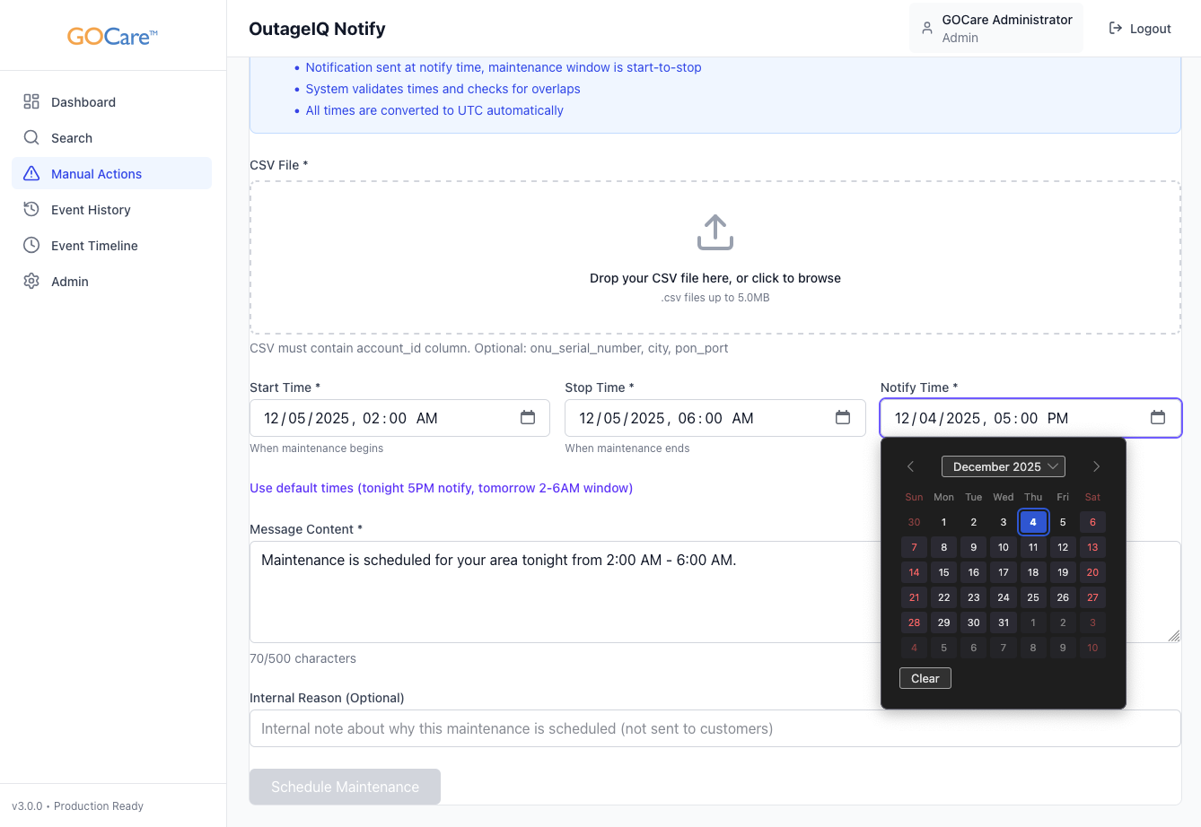 OutageIQ is GOCare’s purpose-built platform for delivering accurate, timely, and reliable outage and maintenance communication to subscribers. It bridges the gap between network events and customer messaging by automating detection, grouping affected subscribers, and managing outbound notifications with high precision.