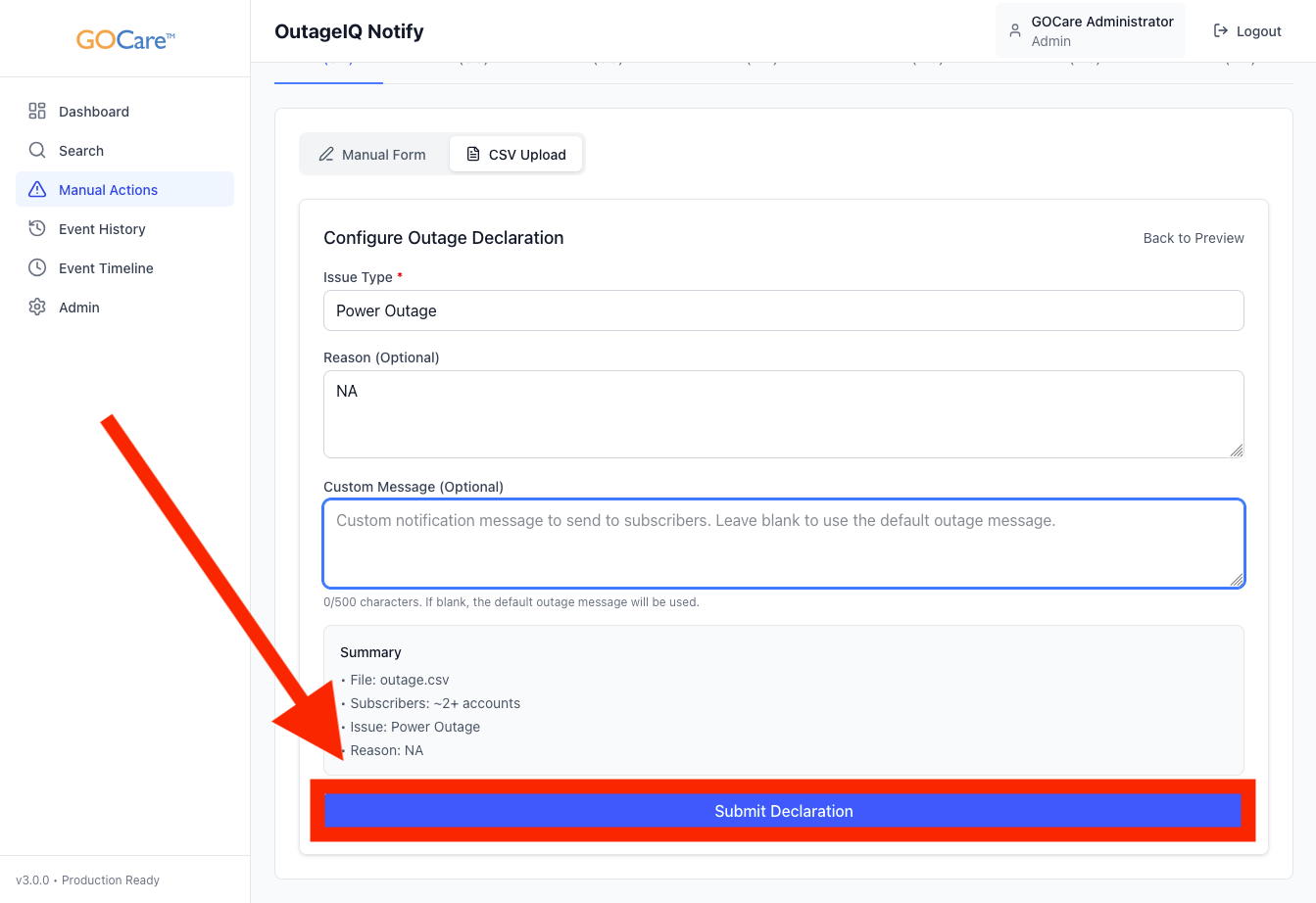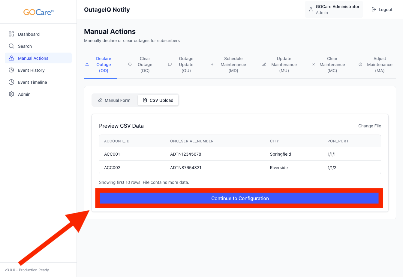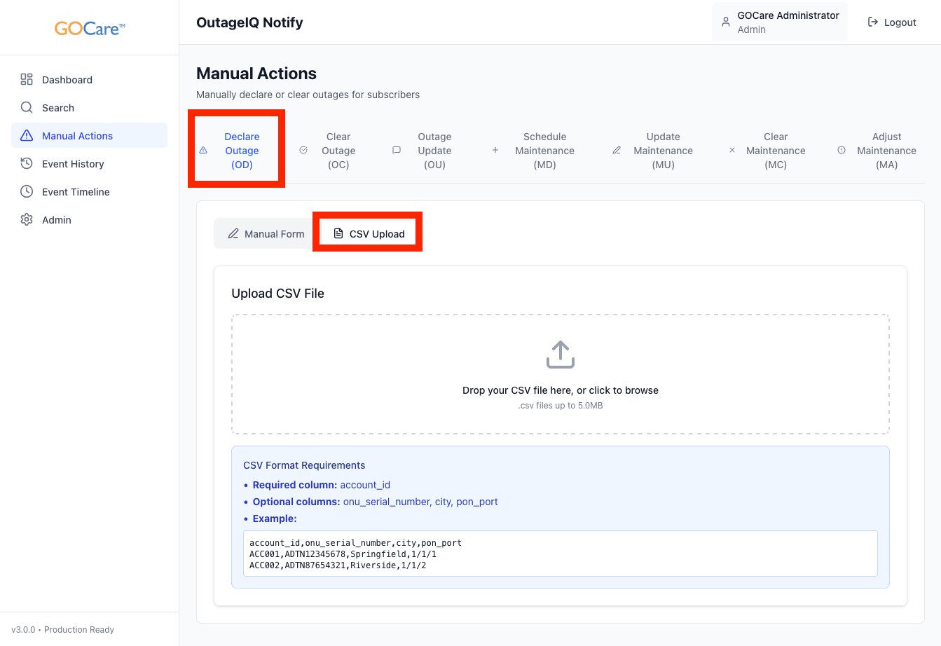CSV upload is the recommended method for declaring outages that affect many subscribers at once. This is especially useful for fiber segment outages, upstream failures, or other large-scale events.
