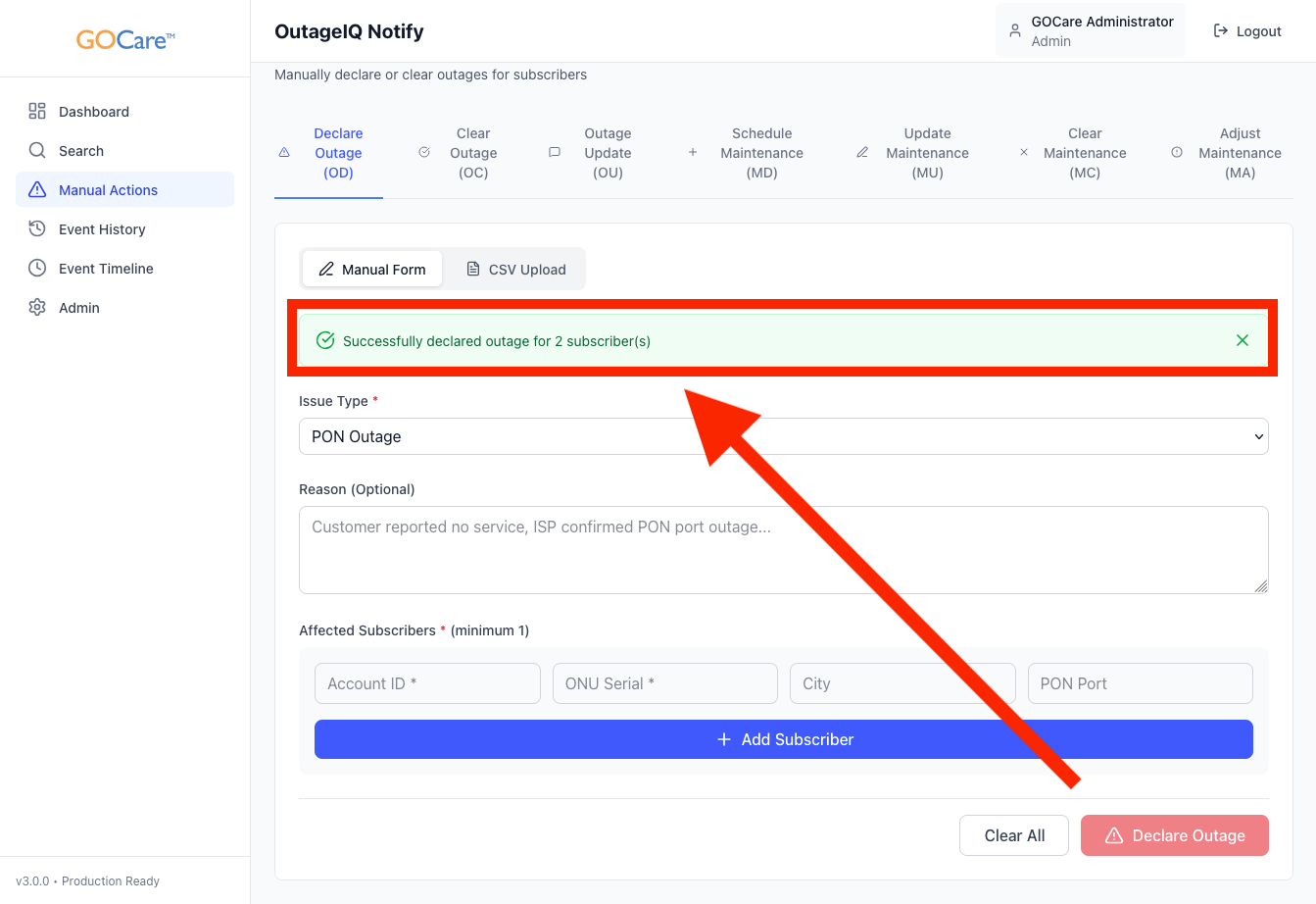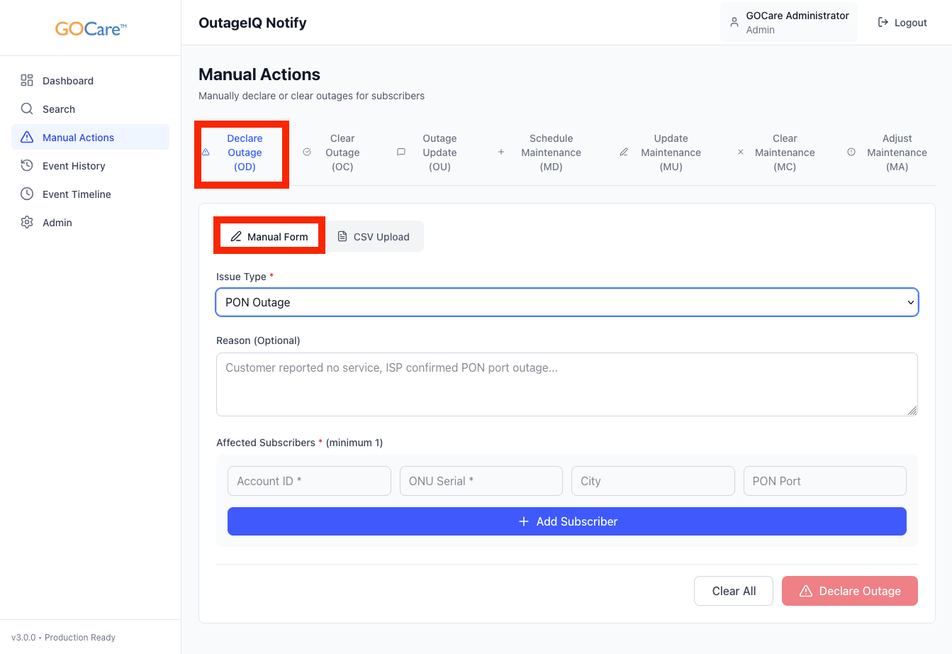 💡Tip: Use manual entry when only a handful of subscribers are affected. For PON-level or large-area outages, use a CSV upload instead for better consistency and control.