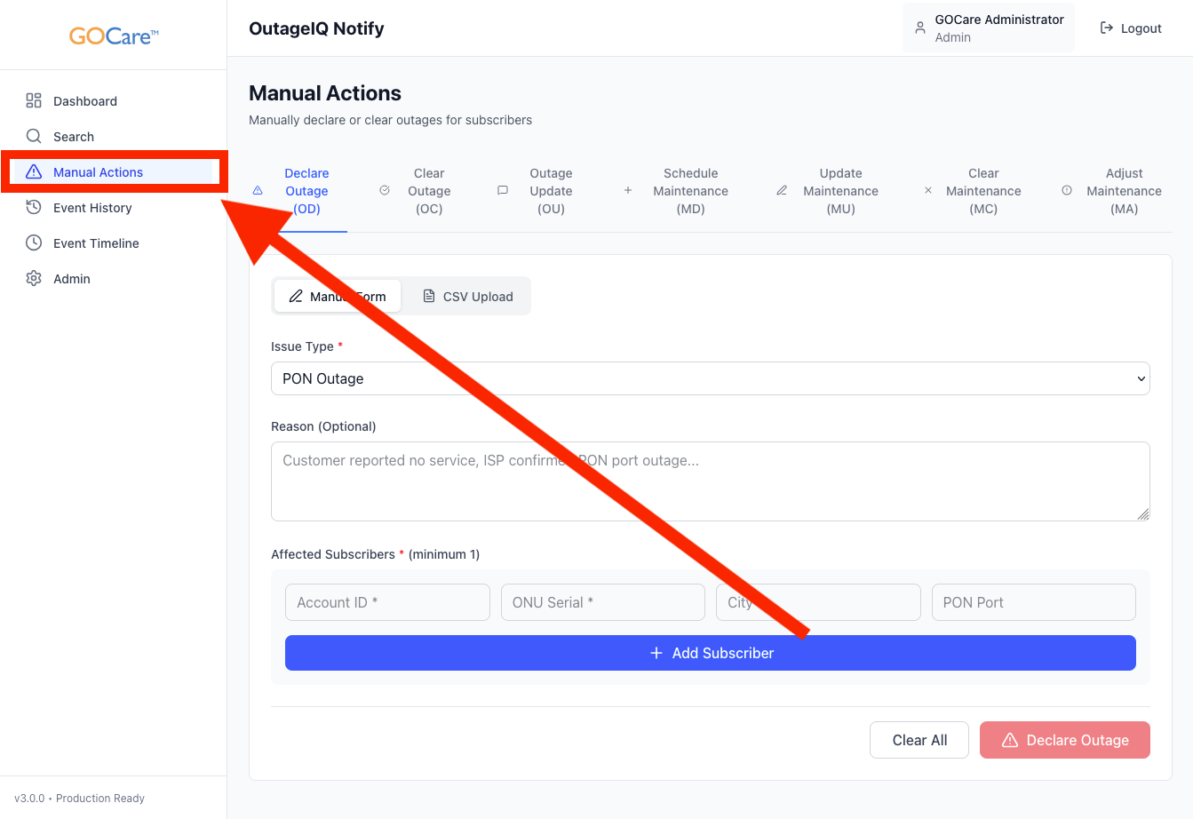 Select Manual Actions from the OutageIQ sidebar.