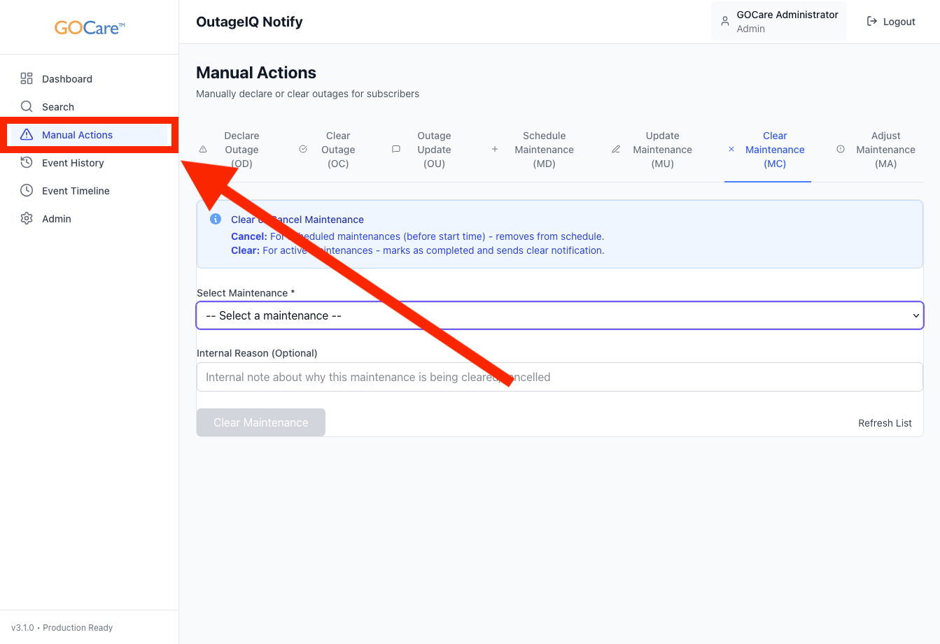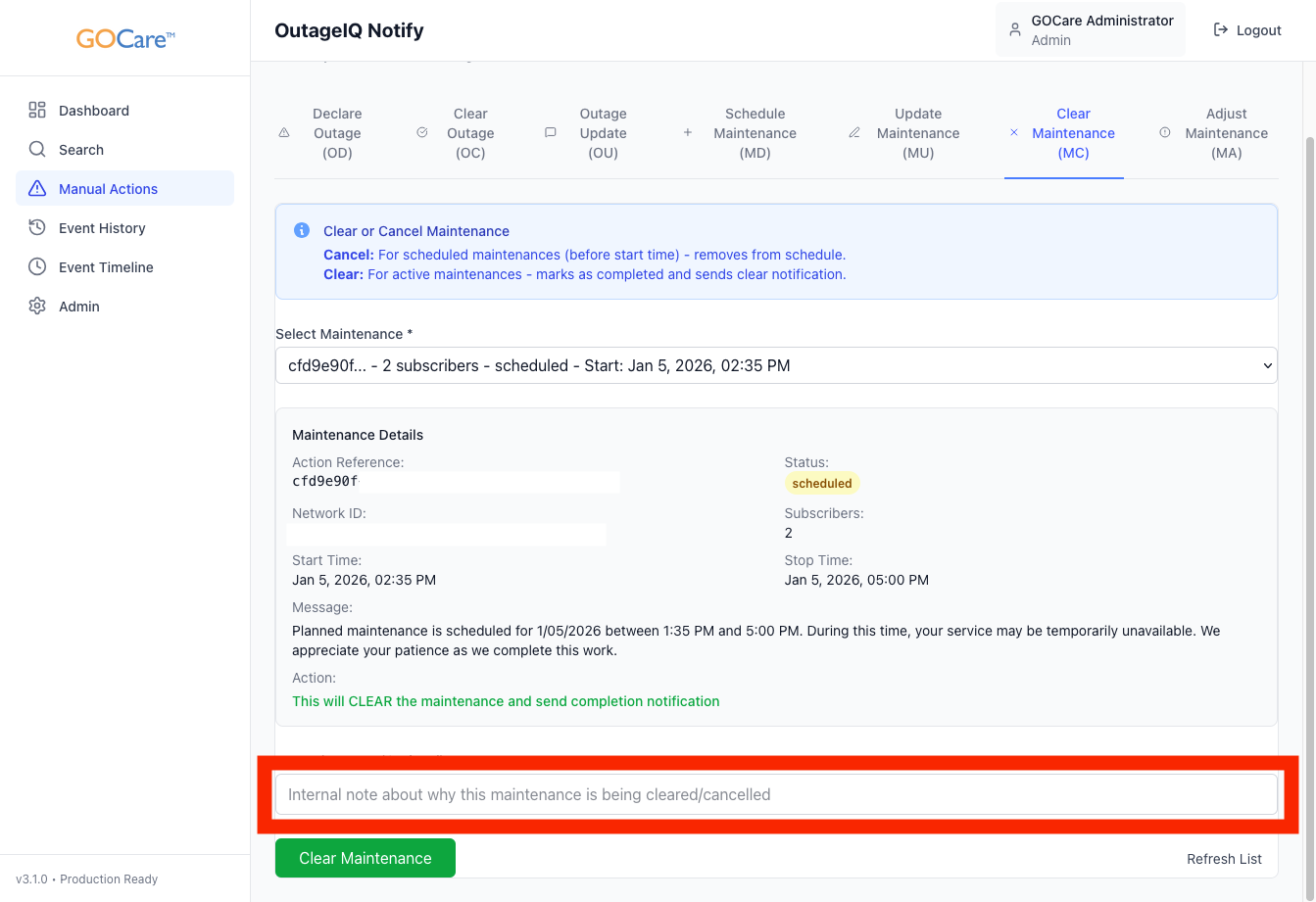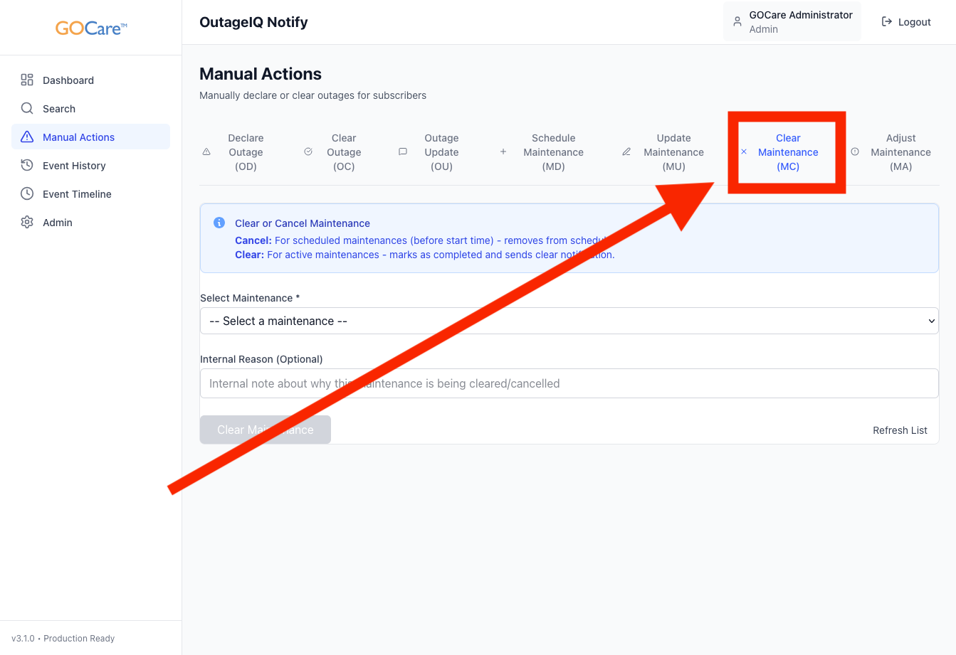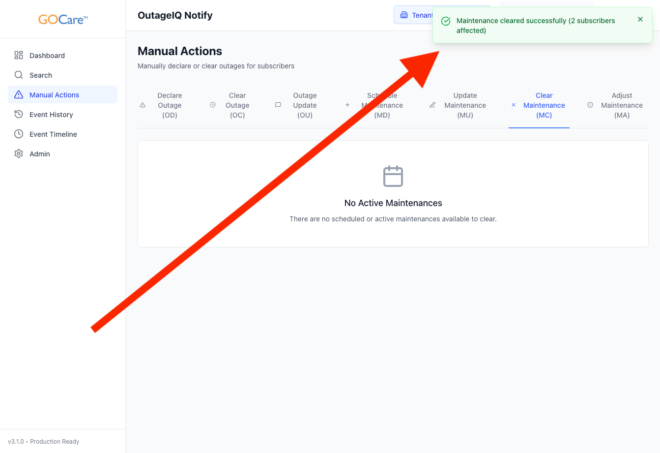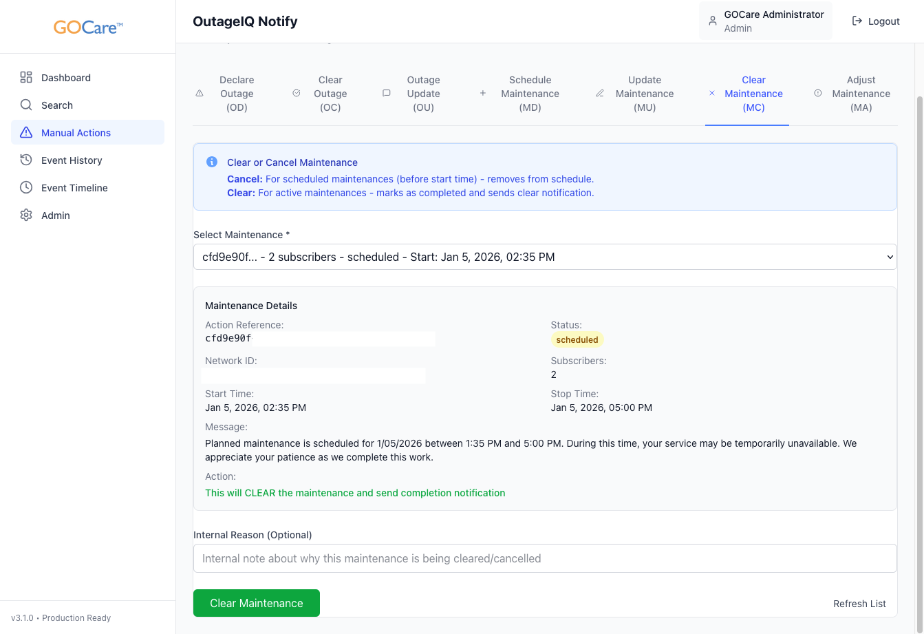 Clearing Maintenance – GOCare OutageIQ